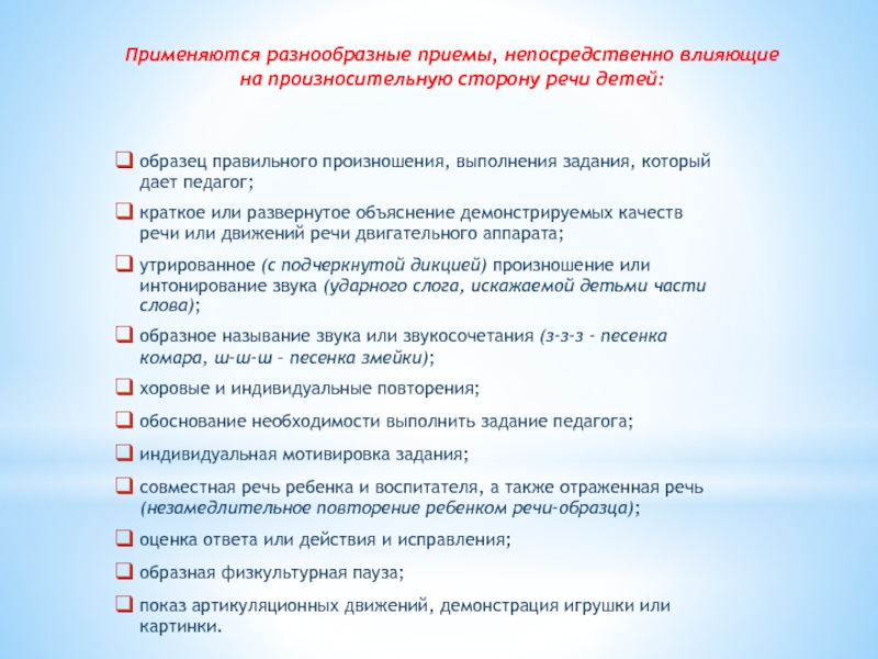 Слайд 16Применяются разнообразные приемы, непосредственно влияющие на произносительную сторону речи детей: