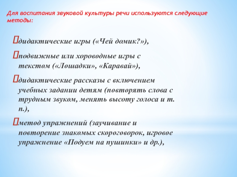 Слайд 15Для воспитания звуковой культуры речи используются следующие методы:
