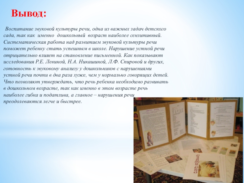 так как именно дошкольный возраст наиболее сензитивный. Систематическая работа над развитием звуковой культуры речи поможет ребенку стать успешным в школе. Нарушение устной речи отрицательно влияет на становление письменной. Как показывают исследования Р.Е. Левиной, Н.А. Никашиной, Л.Ф. Спировой и других, готовность к звуковому анализу у дошкольников с нарушениями устной речи почти в два раза хуже, чем у нормально говорящих детей. Что позволяют утверждать, что речь ребенка необходимо развивать в дошкольном возрасте, так как именно в этом возрасте речь наиболее гибка и податлива, а главное – нарушения речи преодолеваются легче и быстрее.