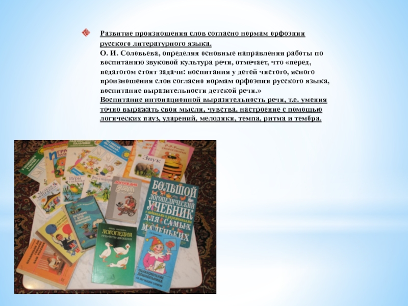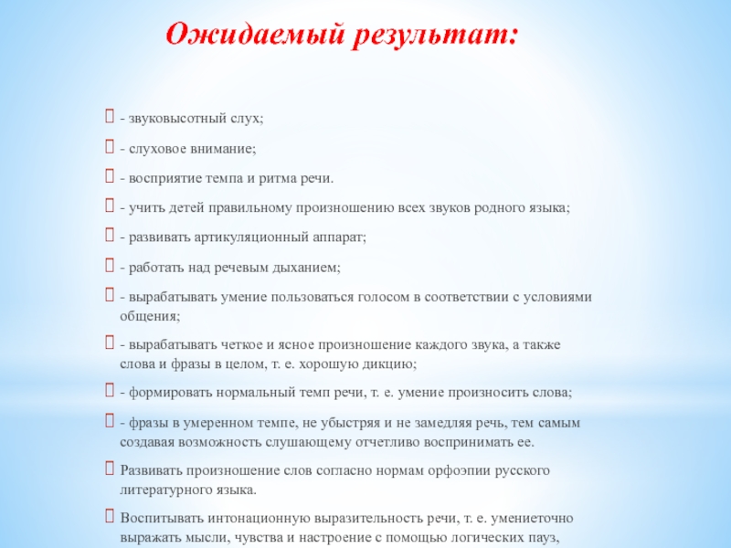 определяя основные направления работы по воспитанию звуковой культура речи, отмечает, что «перед, педагогом стоят задачи: воспитания у детей чистого, ясного произношения слов согласно нормам орфоэпии русского языка, воспитание выразительности детской речи.»