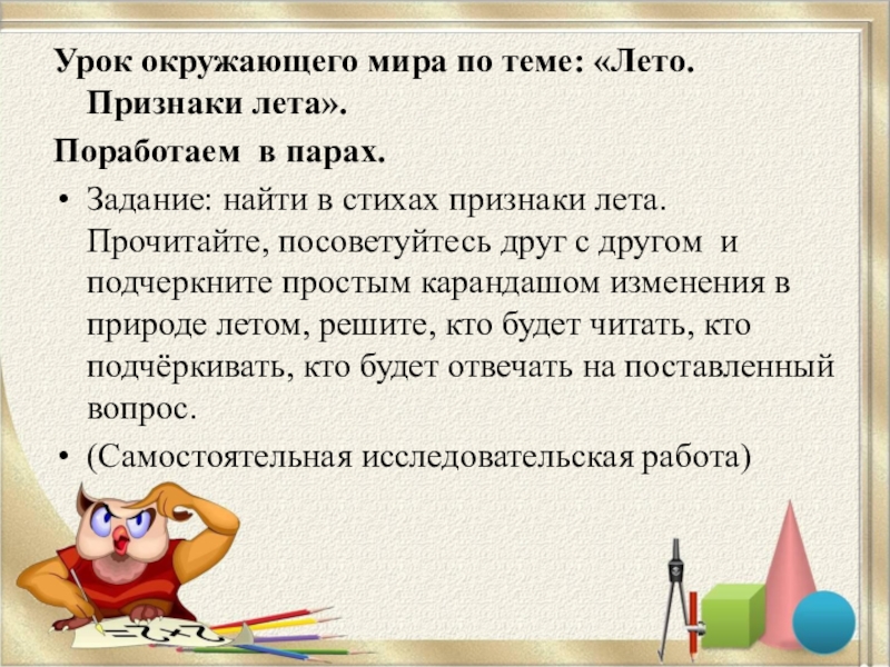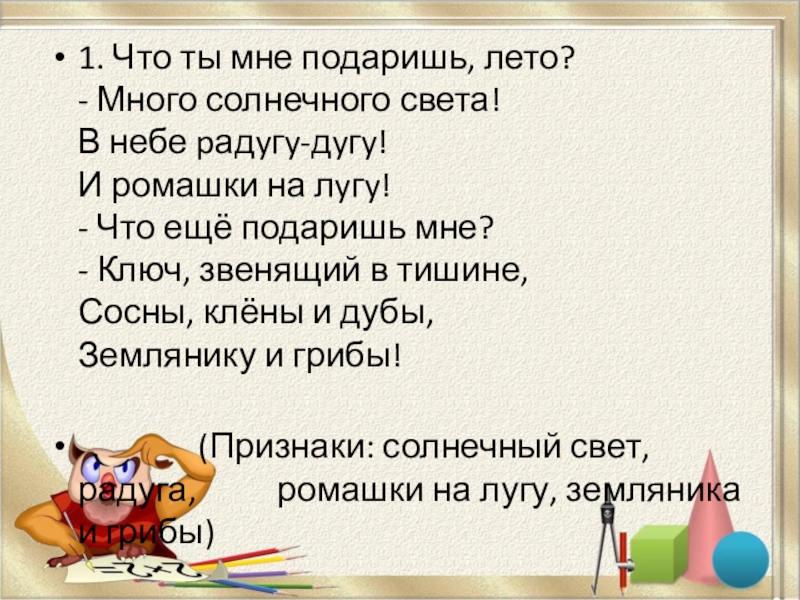 в стихах признаки лета. Прочитайте, посоветуйтесь друг с другом и подчеркните простым карандашом изменения в природе летом, решите, кто будет читать, кто подчёркивать, кто будет отвечать на поставленный вопрос.