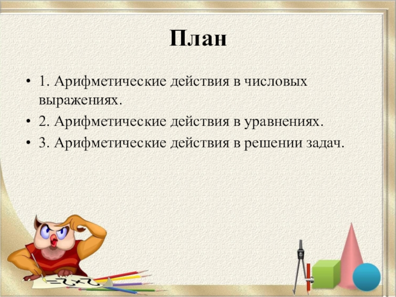 - Сформулируйте цель урока? (Будем тренироваться решать уравнения, задачи, числовые выражения.)