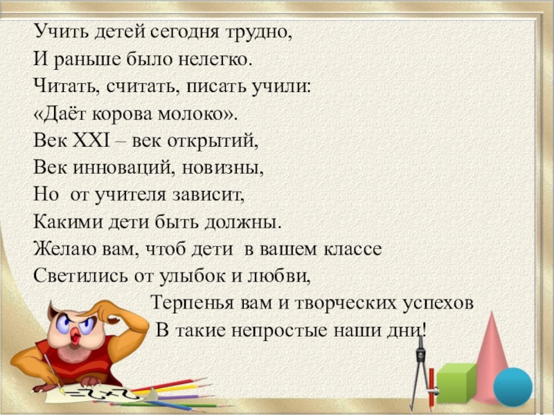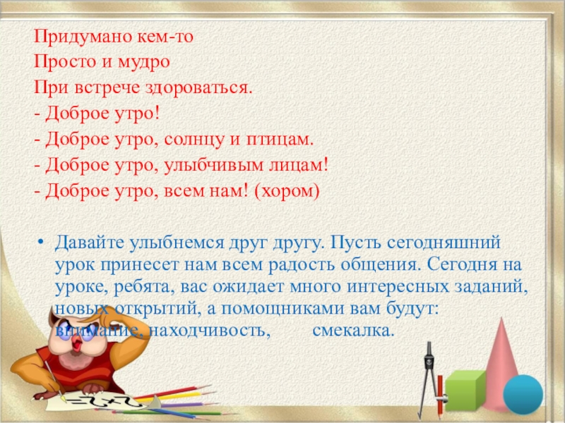 Давайте улыбнемся друг другу. Пусть сегодняшний урок принесет нам всем радость общения. Сегодня на уроке, ребята, вас ожидает много интересных заданий, новых открытий, а помощниками вам будут: внимание, находчивость, смекалка.