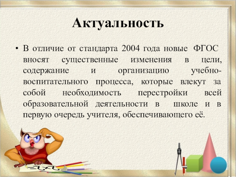 в цели, содержание и организацию учебно-воспитательного процесса, которые влекут за собой необходимость перестройки всей образовательной деятельности в школе и в первую очередь учителя, обеспечивающего её.