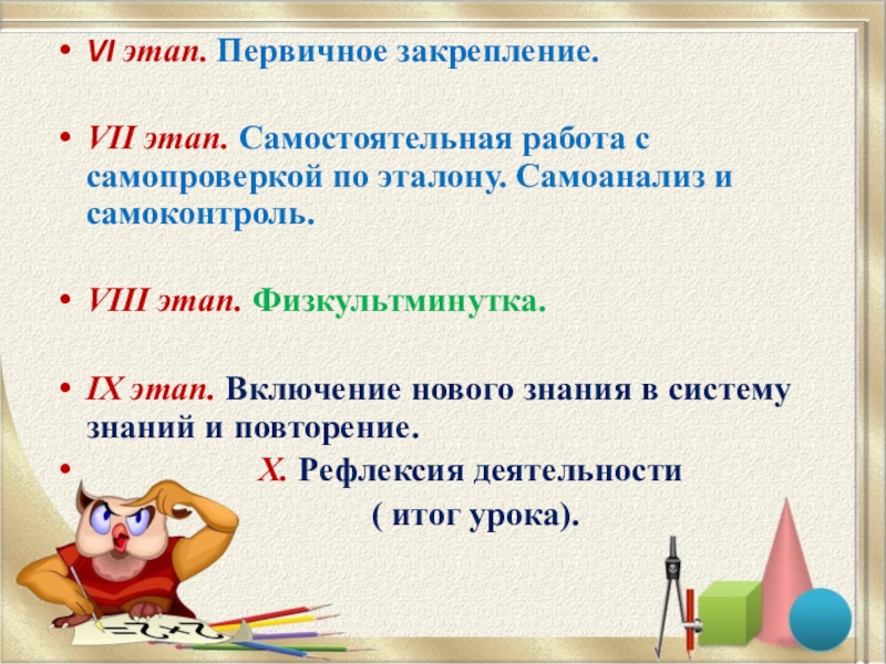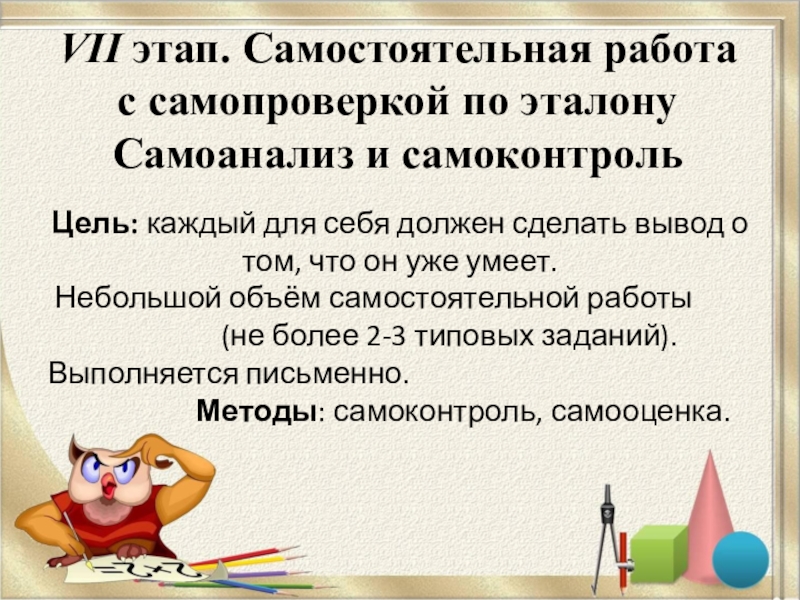 Слайд 23VII этап. Самостоятельная работа с самопроверкой по эталону Самоанализ и самоконтроль