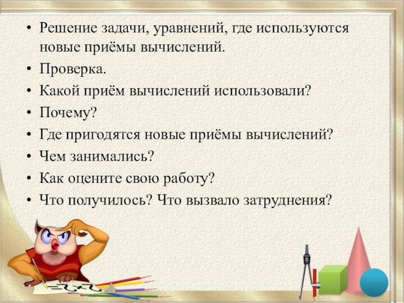 Слайд 26Решение задачи, уравнений, где используются новые приёмы вычислений.