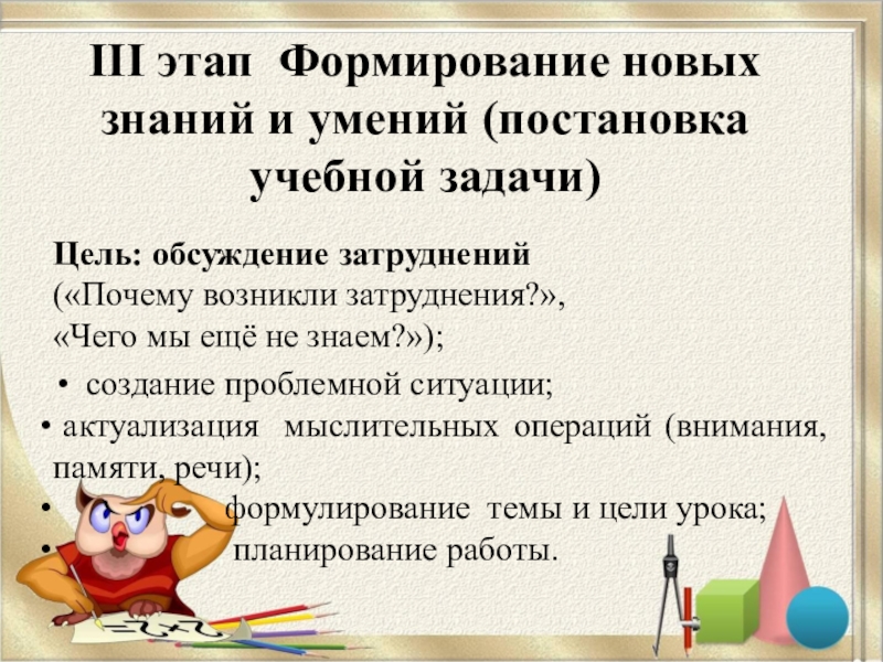 Слайд 13III этап Формирование новых знаний и умений (постановка учебной задачи)