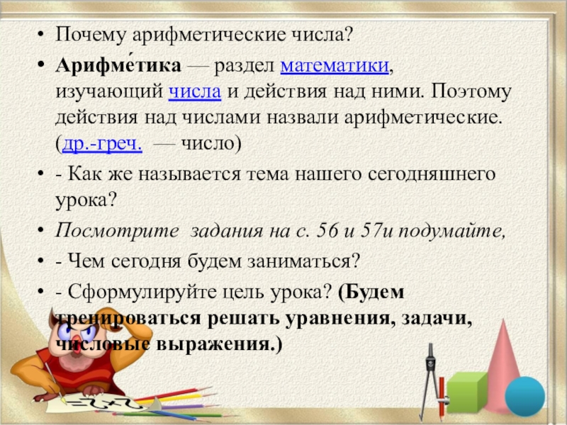 Арифме́тика — раздел математики, изучающий числа и действия над ними. Поэтому действия