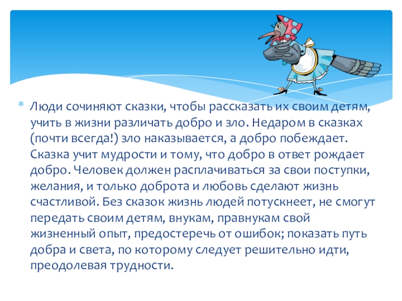 различать добро и зло. Недаром в сказках (почти всегда!) зло наказывается, а добро побеждает. Сказка учит мудрости и тому, что добро в ответ рождает добро. Человек должен расплачиваться за свои поступки, желания, и только доброта и любовь сделают жизнь счастливой. Без сказок жизнь людей потускнеет, не смогут передать своим детям, внукам, правнукам свой жизненный опыт, предостеречь от ошибок; показать путь добра и света, по которому следует решительно идти, преодолевая трудности.
