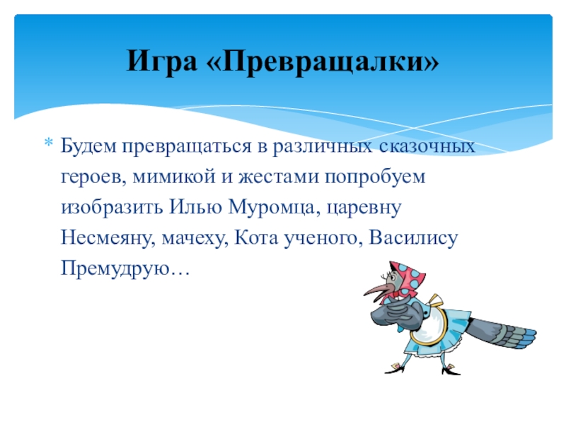 Слайд 10Будем превращаться в различных сказочных героев, мимикой и жестами попробуем изобразить
