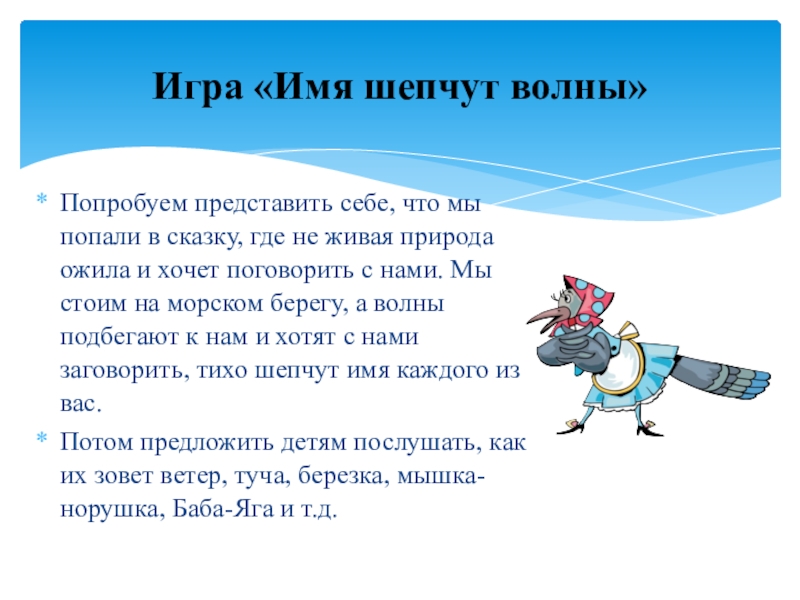 Потом предложить детям послушать, как их зовет ветер, туча, березка, мышка-норушка, Баба-Яга и т.д.