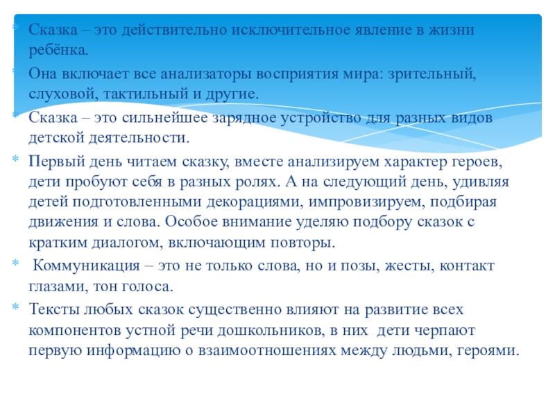 Тексты любых сказок существенно влияют на развитие всех компонентов устной речи дошкольников, в них дети черпают первую информацию о взаимоотношениях между людьми, героями.