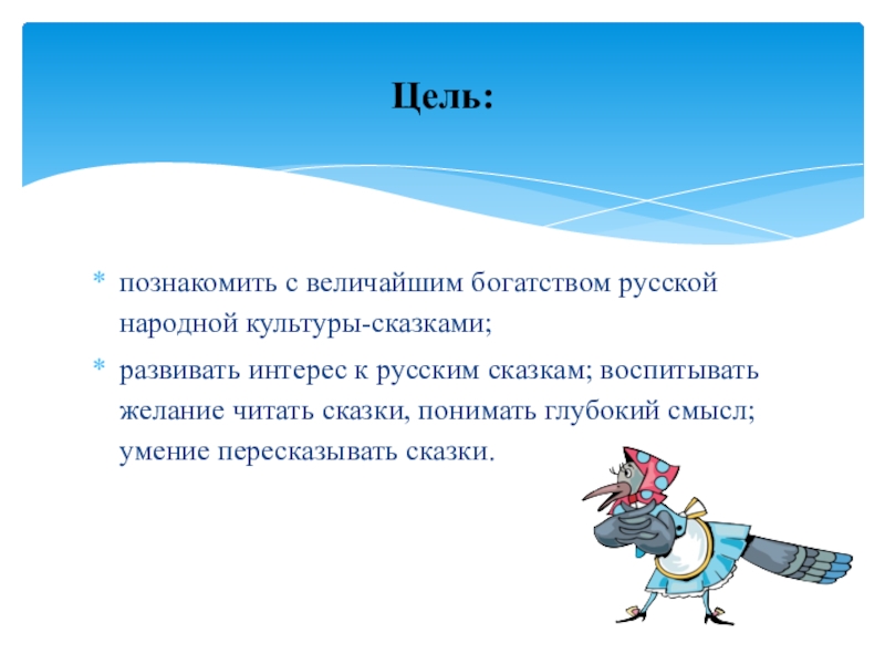 Слайд 2познакомить с величайшим богатством русской народной культуры-сказками;