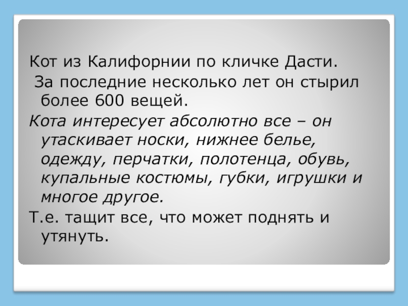 Кота интересует абсолютно все – он утаскивает носки, нижнее белье, одежду, перчатки, полотенца, обувь, купальные костюмы, губки, игрушки и многое другое.