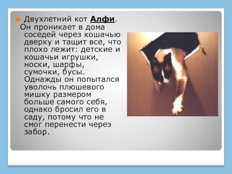 юго-западе Англии рассказала , что ей стыдно за Томми перед соседями. По ночам вороватый кот выходит сквозь специальную кошачью створку, и возвращается с добычей. Не размениваясь на мелочи вроде продуктов, Томми приносит домой качественную обувь, одежду от ведущих дизайнеров, а однажды принес мешочек монет и зонт для гольфа.