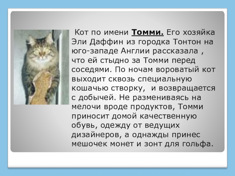 Слайд 19 Кот по имени Томми. Его хозяйка Эли Даффин из городка Тонтон на