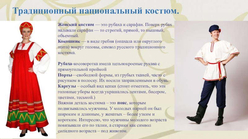 Важная деталь костюма – это пояс, которым подвязывались мужчины. У молодых парней он был широким и длинным, у женатых – более узким и коротким. Интересно, что мужчины молодого возраста повязывали его по талии, а старики как символ солидного возраста – под животом.