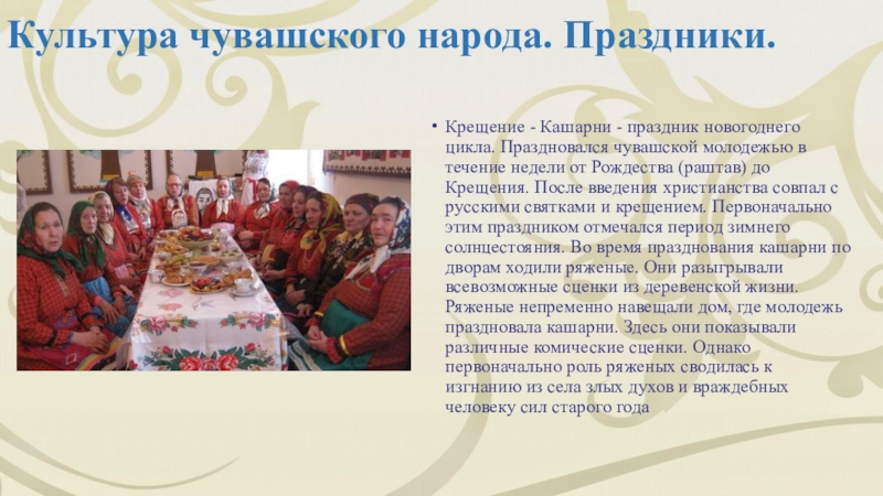 Праздновался чувашской молодежью в течение недели от Рождества (раштав) до Крещения. После введения христианства совпал с русскими святками и крещением. Первоначально этим праздником отмечался период зимнего солнцестояния. Во время празднования кашарни по дворам ходили ряженые. Они разыгрывали всевозможные сценки из деревенской жизни. Ряженые непременно навещали дом, где молодежь праздновала кашарни. Здесь они показывали различные комические сценки. Однако первоначально роль ряженых сводилась к изгнанию из села злых духов и враждебных человеку сил старого года