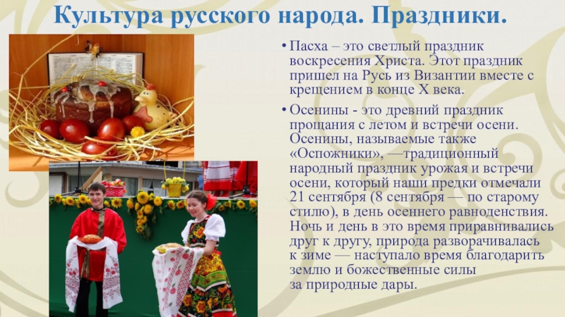 Осенины - это древний праздник прощания с летом и встречи осени. Осенины, называемые также «Оспожники», —традиционный народный праздник урожая и встречи осени, который наши предки отмечали 21 сентября (8 сентября — по старому стилю), в день осеннего равноденствия. Ночь и день в это время приравнивались друг к другу, природа разворачивалась к зиме — наступало время благодарить землю и божественные силы за природные дары.