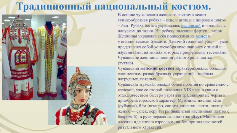 – кепе и штаны с широким шагом – йем. Рубаха богата украшалась вышивкой и носилась с напуском на талии. На рубаху надевали фартук – запон. Женщины украшали себя подвесками из монет и металлическими бляхами. Девичий головной убор – тухья представлял собой конусообразную шапочку с тикой и наушниками, на концах которых прикреплены тесёмками. Чувашские женщины носили разного рода платки (туттар).