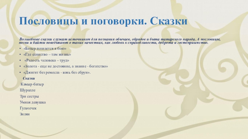 обрядов и быта татарского народа. А пословицы, песни и байты поведывают о таких качествах, как любовь к справедливости, доброта и гостеприимство.