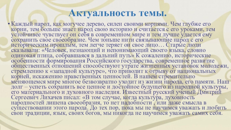 его корни, тем больше знает народ свою историю и считается с его уроками, тем устойчивее чувствует он себя в современном мире и тем лучше удается ему сохранить свое своеобразие. Чем тоньше нити связывающие народ с его историческим прошлым, тем легче теряет он свое лицо… Старые люди сказывали: «Человек, незнающий и непонимающий своего языка, словно одинокая птица, собравшаяся в дальний путь» К сожалению, исторические особенности формирования Российского государства, современное развитие общественных отношений способствуют утрате жизненных установок молодежи, стремлению к «западной культуре», что приводит к отрыву от национальных корней, искажению нравственных ценностей. В нашем стремительно меняющемся мире многое безвозвратно уходит из жизни народа, его памяти. Наш долг – успеть сохранить все ценное и достойное будущего из народной культуры, его материального и духовного наследия. Известный русский ученый Дмитрий Сергеевич Лихачев писал: «В том случае, когда культура, духовность народностей лишена своеобразия, то нет надобности , или даже смысла в существовании этого народа. До тех пор, пока мы не научимся уважать и любить свои традиции, язык, своих богов, мы никогда не научимся уважать самих себя.