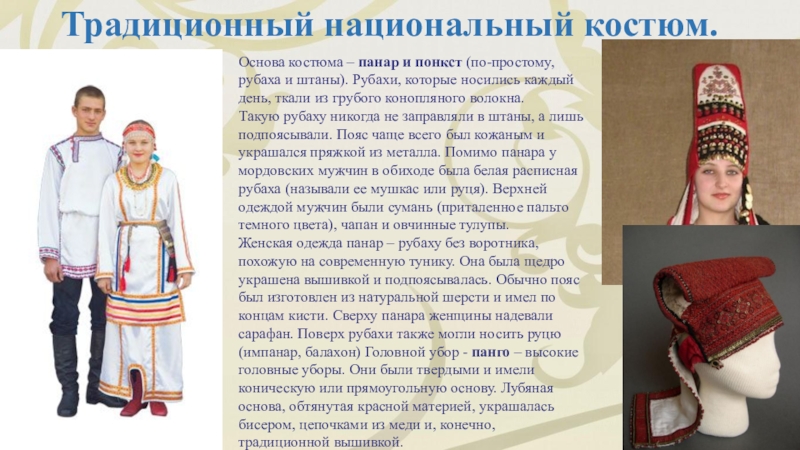 Такую рубаху никогда не заправляли в штаны, а лишь подпоясывали. Пояс чаще всего был кожаным и украшался пряжкой из металла. Помимо панара у мордовских мужчин в обиходе была белая расписная рубаха (называли ее мушкас или руця). Верхней одеждой мужчин были сумань (приталенное пальто темного цвета), чапан и овчинные тулупы.