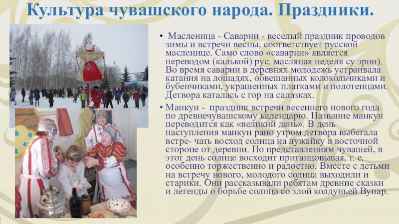Манкун - праздник встречи весеннего нового года по древнечувашскому календарю. Название манкун переводится как «великий день». В день наступления манкун рано утром детвора выбегала встре- чать восход солнца на лужайку в восточной стороне от деревни. По представлениям чувашей, в этот день солнце восходит пританцовывая, т. е. особенно торжественно и радостно. Вместе с детьми на встречу нового, молодого солнца выходили и старики. Они рассказывали ребятам древние сказки и легенды о борьбе солнца со злой колдуньей Вупар.