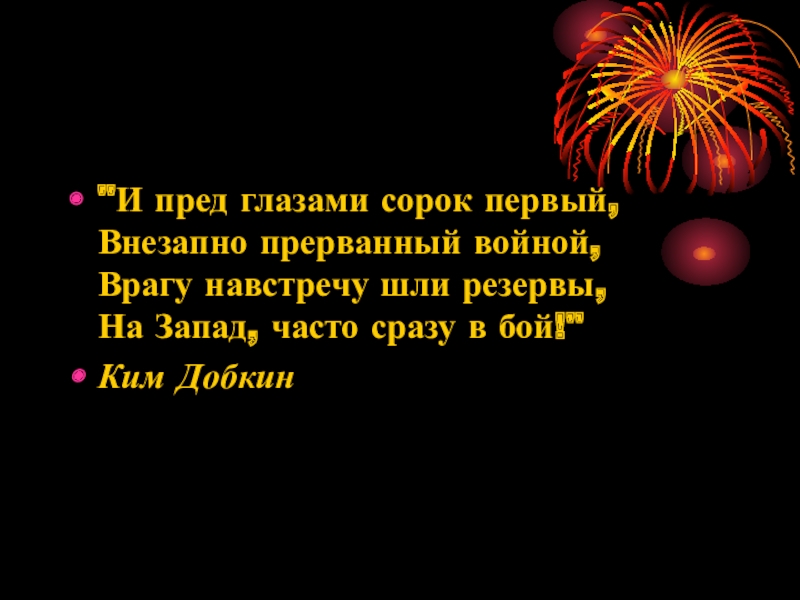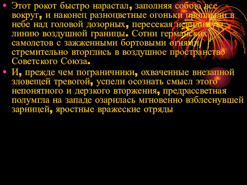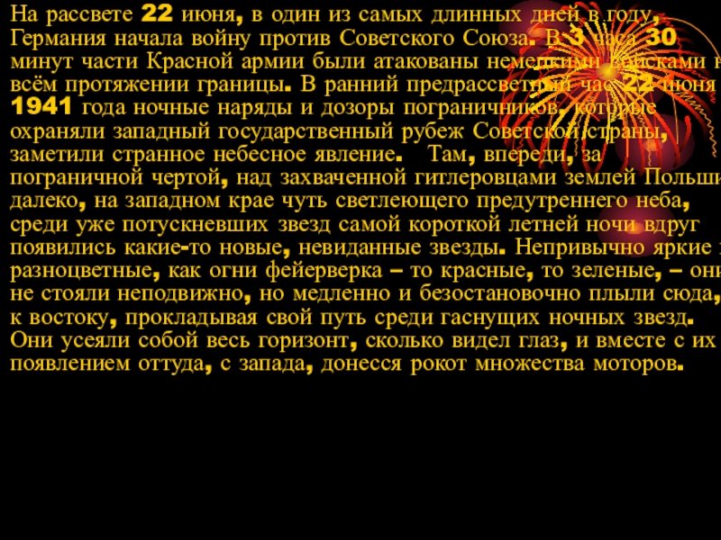 году, Германия начала войну против Советского Союза. В 3 часа 30 минут части Красной армии были атакованы немецкими войсками на всём протяжении границы. В ранний предрассветный час 22 июня 1941 года ночные наряды и дозоры пограничников, которые охраняли западный государственный рубеж Советской страны, заметили странное небесное явление. Там, впереди, за пограничной чертой, над захваченной гитлеровцами землей Польши, далеко, на западном крае чуть светлеющего предутреннего неба, среди уже потускневших звезд самой короткой летней ночи вдруг появились какие-то новые, невиданные звезды. Непривычно яркие и разноцветные, как огни фейерверка – то красные, то зеленые, – они не стояли неподвижно, но медленно и безостановочно плыли сюда, к востоку, прокладывая свой путь среди гаснущих ночных звезд. Они усеяли собой весь горизонт, сколько видел глаз, и вместе с их появлением оттуда, с запада, донесся рокот множества моторов.
