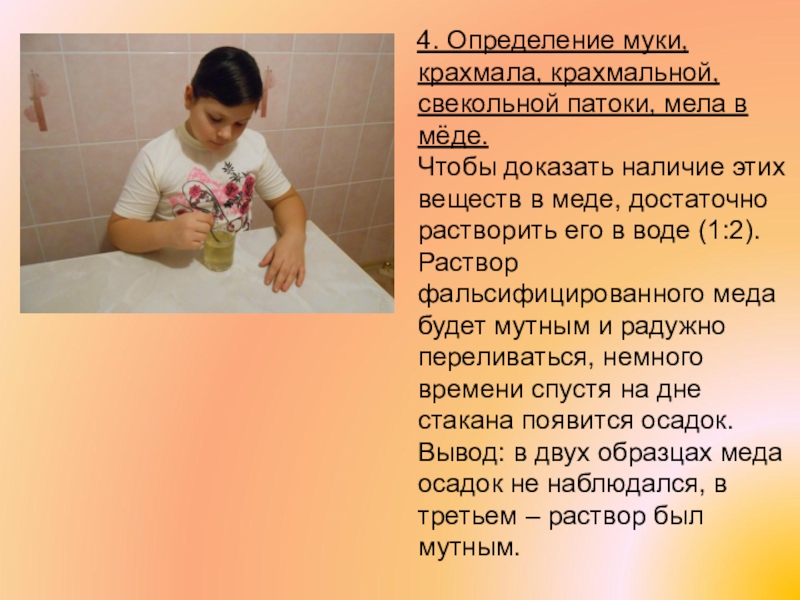 Слайд 14 4. Определение муки, крахмала, крахмальной, свекольной патоки, мела в