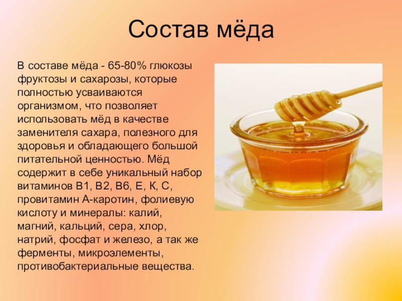 полностью усваиваются организмом, что позволяет использовать мёд в качестве заменителя сахара, полезного для здоровья и обладающего большой питательной ценностью. Мёд содержит в себе уникальный набор витаминов В1, В2, В6, Е, К, С, провитамин А-каротин, фолиевую кислоту и минералы: калий, магний, кальций, сера, хлор, натрий, фосфат и железо, а так же ферменты, микроэлементы, противобактериальные вещества.