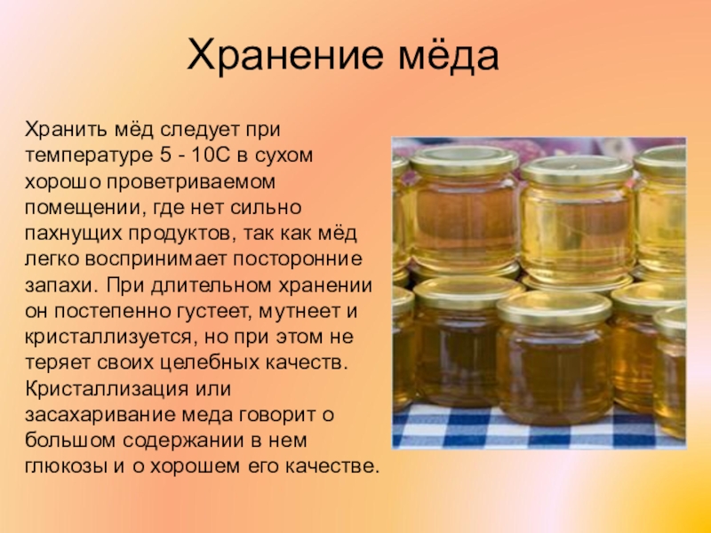 хорошо проветриваемом помещении, где нет сильно пахнущих продуктов, так как мёд легко воспринимает посторонние запахи. При длительном хранении он постепенно густеет, мутнеет и кристаллизуется, но при этом не теряет своих целебных качеств. Кристаллизация или засахаривание меда говорит о большом содержании в нем глюкозы и о хорошем его качестве.