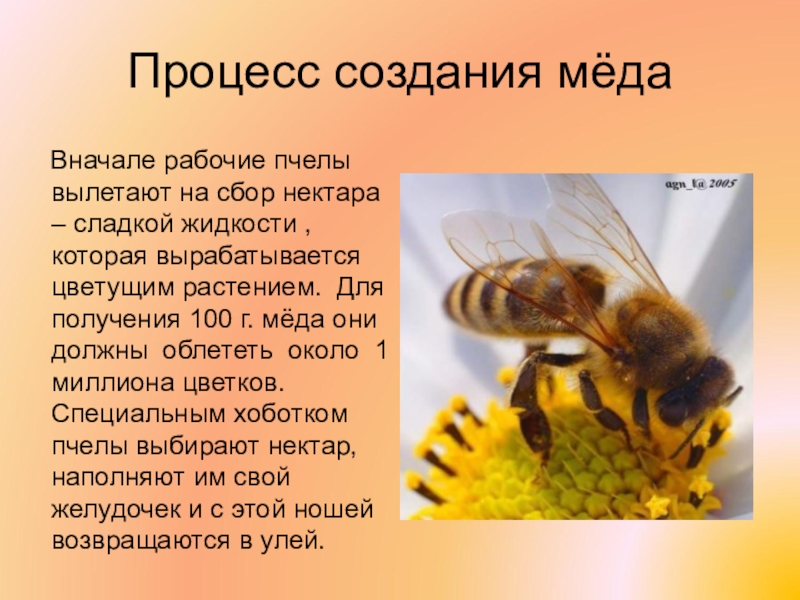 – сладкой жидкости , которая вырабатывается цветущим растением. Для получения 100 г. мёда они должны облететь около 1 миллиона цветков. Специальным хоботком пчелы выбирают нектар, наполняют им свой желудочек и с этой ношей возвращаются в улей.