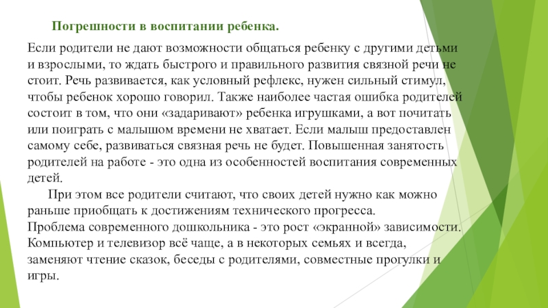 с другими детьми и взрослыми, то ждать быстрого и правильного развития связной речи не стоит. Речь развивается, как условный рефлекс, нужен сильный стимул, чтобы ребенок хорошо говорил. Также наиболее частая ошибка родителей состоит в том, что они «задаривают» ребенка игрушками, а вот почитать или поиграть с малышом времени не хватает. Если малыш предоставлен самому себе, развиваться связная речь не будет. Повышенная занятость родителей на работе - это одна из особенностей воспитания современных детей.