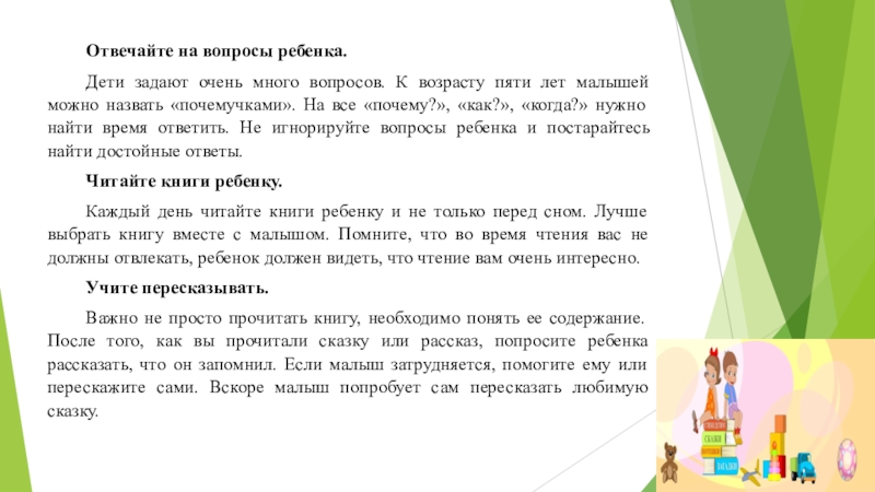 пяти лет малышей можно назвать «почемучками». На все «почему?», «как?», «когда?» нужно найти время ответить. Не игнорируйте вопросы ребенка и постарайтесь найти достойные ответы.