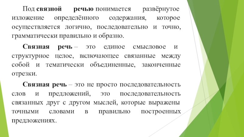 Слайд 4Под связной речью понимается развёрнутое изложение определённого содержания, которое осуществляется логично, последовательно и