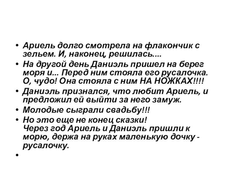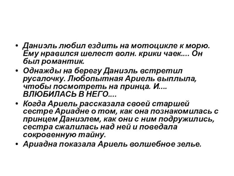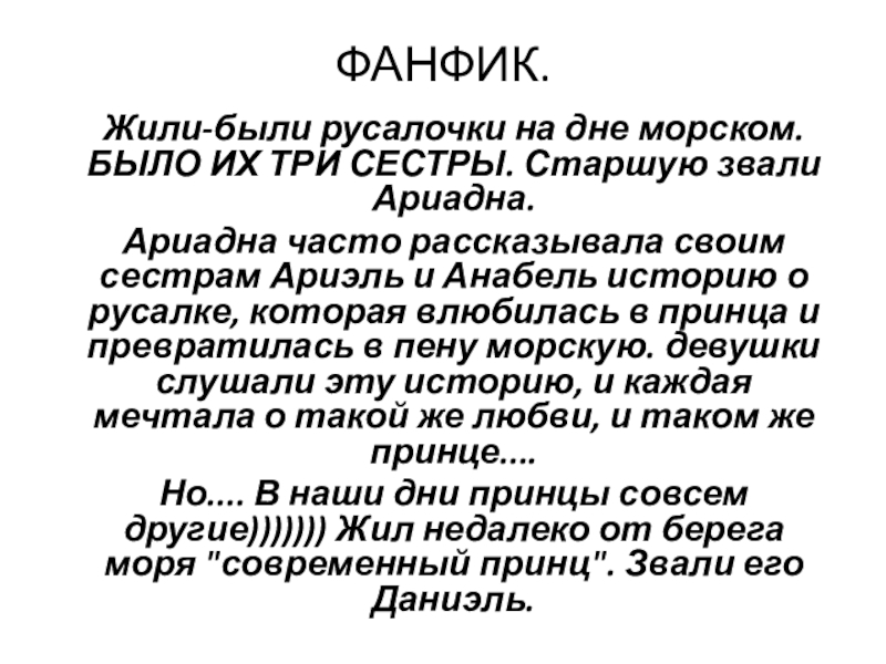 Ариадна часто рассказывала своим сестрам Ариэль и Анабель историю о русалке, которая влюбилась в принца и превратилась в пену морскую. девушки слушали эту историю, и каждая мечтала о такой же любви, и таком же принце....