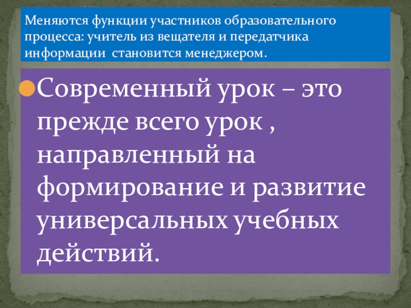 Меняются функции участников образовательного процесса: учитель из вещателя и передатчика информации становится менеджером.