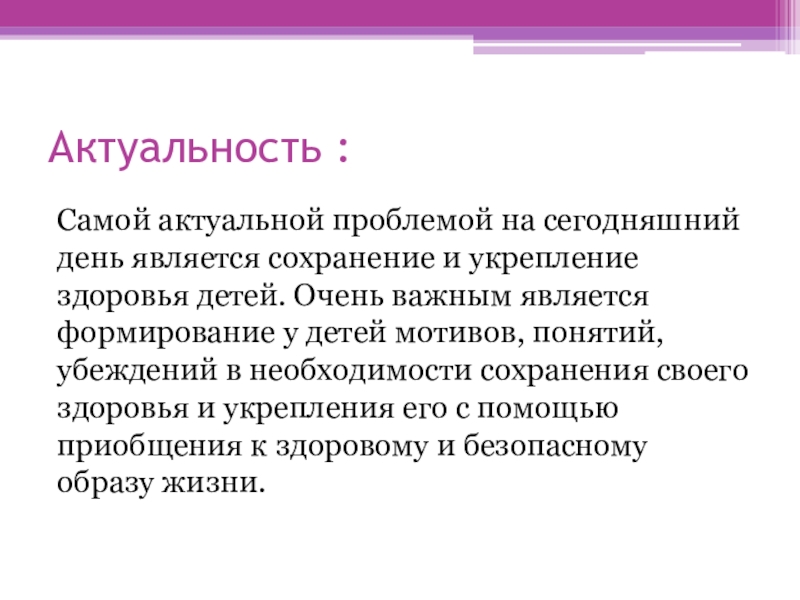 здоровья детей. Очень важным является формирование у детей мотивов, понятий, убеждений в необходимости сохранения своего здоровья и укрепления его с помощью приобщения к здоровому и безопасному образу жизни.