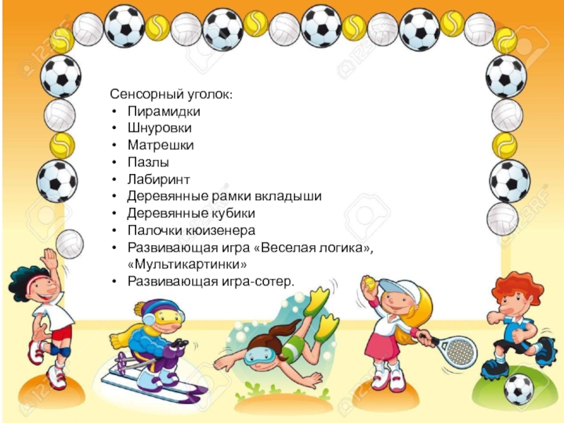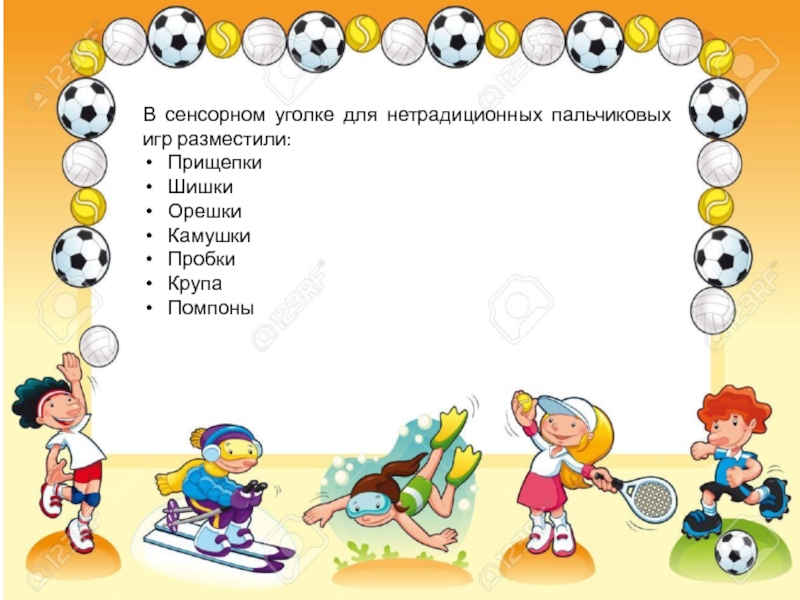 Слайд 23В сенсорном уголке для нетрадиционных пальчиковых игр разместили: