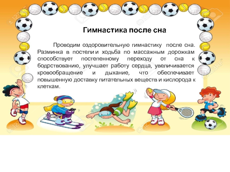 Проводим оздоровительную гимнастику после сна. Разминка в постели и ходьба по массажным дорожкам способствует постепенному переходу от сна к бодрствованию, улучшает работу сердца, увеличивается кровообращение и дыхание, что обеспечивает повышенную доставку питательных веществ и кислорода к клеткам.