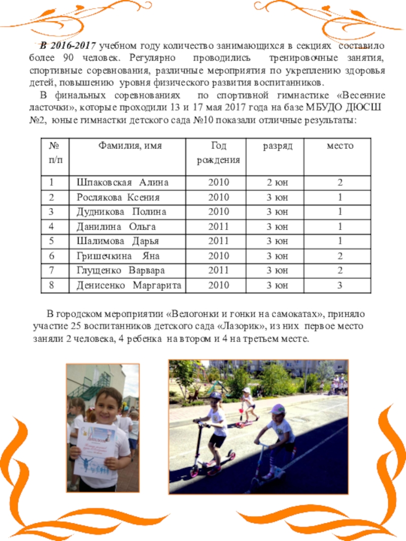 В городском мероприятии «Велогонки и гонки на самокатах», приняло участие 25 воспитанников детского сада «Лазорик», из них первое место заняли 2 человека, 4 ребенка на втором и 4 на третьем месте.