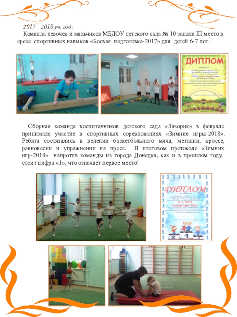 Сборная команда воспитанников детского сада «Лазорик» в феврале принимала участие в спортивных соревнованиях «Зимние игры-2018». Ребята состязались в ведении баскетбольного мяча, метании, кроссе, равновесии и упражнении на пресс. В итоговом протоколе «Зимних игр-2018» напротив команды из города Донецка, как и в прошлом году, стоит цифра «1», что означает первое место!