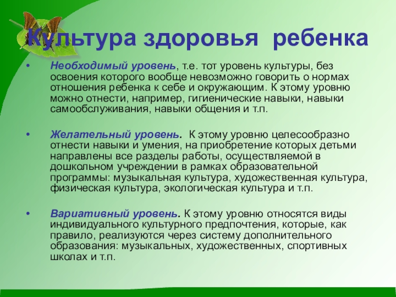 Желательный уровень. К этому уровню целесообразно отнести навыки и умения, на приобретение которых детьми направлены все разделы работы, осуществляемой в дошкольном учреждении в рамках образовательной программы: музыкальная культура, художественная культура, физическая культура, экологическая культура и т.п.
