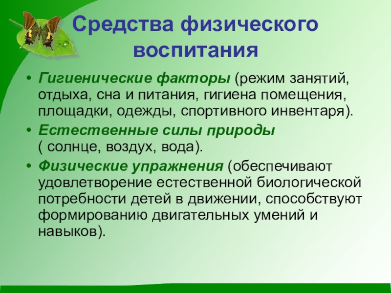 Физические упражнения (обеспечивают удовлетворение естественной биологической потребности детей в движении, способствуют формированию двигательных умений и навыков).