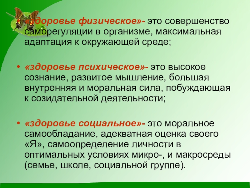 Слайд 4«здоровье физическое»- это совершенство саморегуляции в организме, максимальная адаптация к окружающей