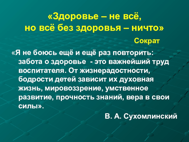 «Я не боюсь ещё и ещё раз повторить: забота о здоровье - это важнейший труд воспитателя. От жизнерадостности, бодрости детей зависит их духовная жизнь, мировоззрение, умственное развитие, прочность знаний, вера в свои силы».