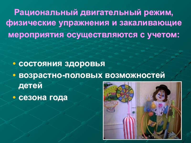 Слайд 15Рациональный двигательный режим, физические упражнения и закаливающие мероприятия осуществляются с учетом:
