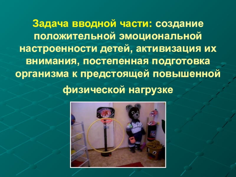 Слайд 23Задача вводной части: создание положительной эмоциональной настроенности детей, активизация их внимания,