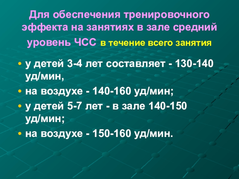 Для обеспечения тренировочного эффекта на занятиях в зале средний уровень ЧСС